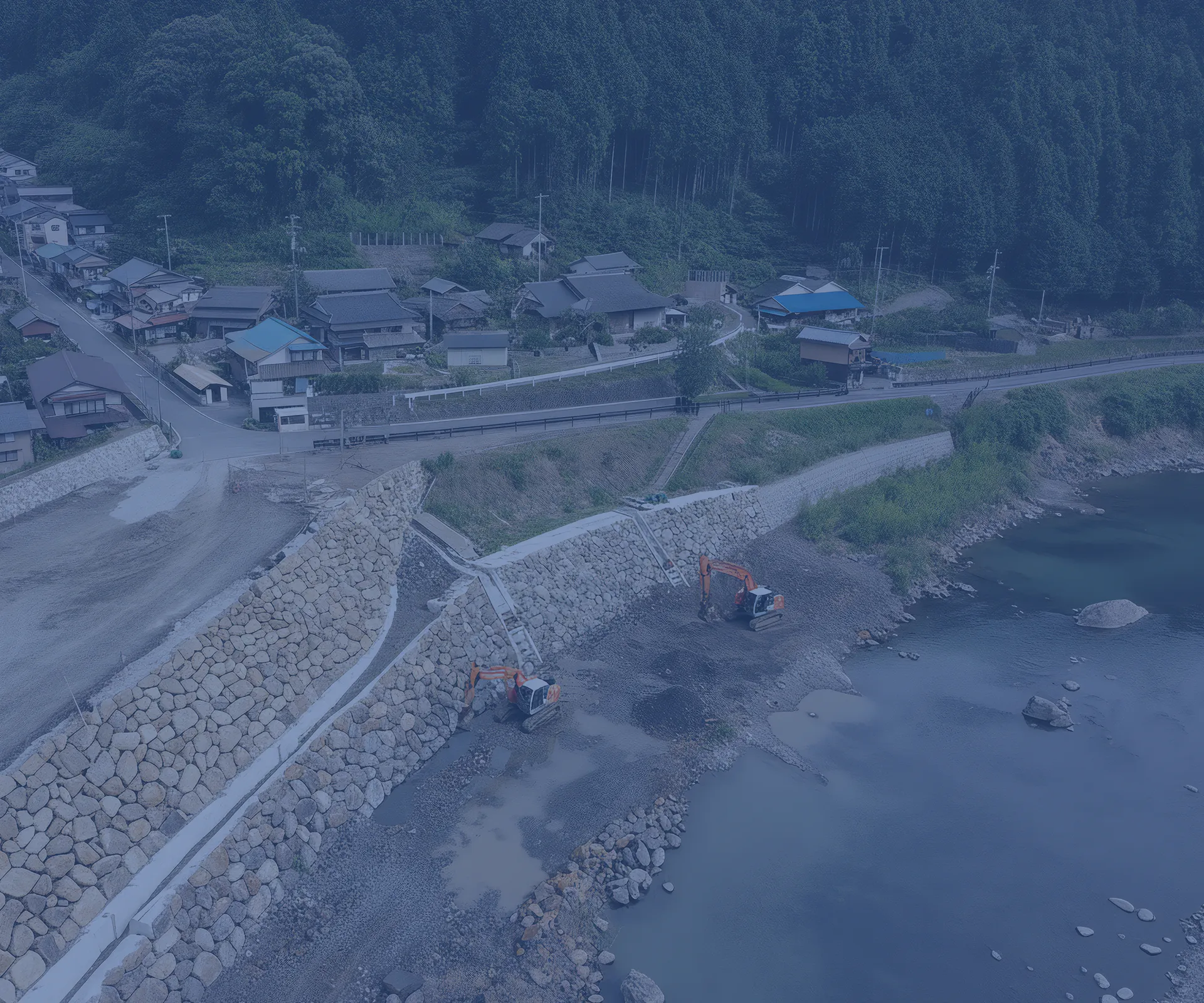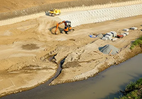 河川の護岸工事や補修を行い、水流による浸食を防ぐ工事です。